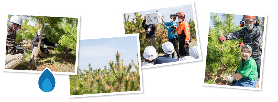 当日は、ブルー&グリーンプロジェクト参加企業などから約60 名が参加し、守る会のメンバーやプロジェクトのイメージキャラクターである谷花音さんと一緒に、順調に成長する松の若木がさらに健やかに伸びるように願いながら、植樹後初の枝打ち作業(下枝払い)にあたりました。
