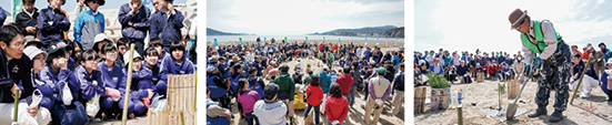 白砂青松の景勝地として知られた名勝・高田松原は、2011 年の大津波で約7 万本あったとされる松が流失しましたが、防潮堤の外に新たに造成された植樹地には、2017 年からの5 年間に約4 万本(うち約1 万本を当財団が寄贈)の松が植えられ、50 年後に美しい高田松原が再生することを願って、守る会を中心とした活動が続けられています。